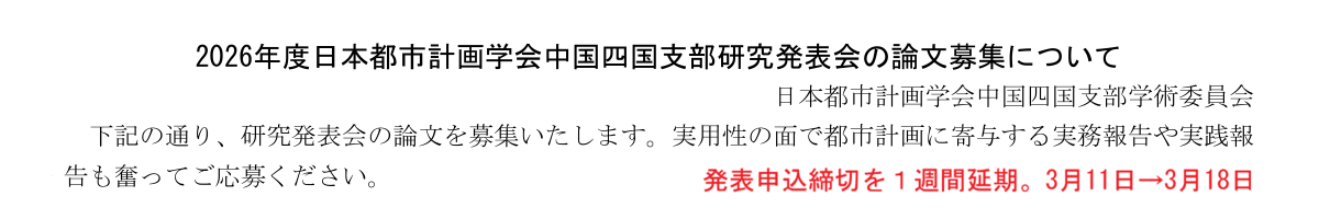 - 2026年度 日本都市計画学会中国四国支部研究発表会■2026年度 日本都市計画学会中国四国支部研究発表会 □ 開催日時:2026年4月11日(土) □ 開催場所:合人社ウェンディひと・まちプラザ 北棟6階 マルチメディアスタジオ(広島市中区袋町6番36号) □ 発表内容 […]
